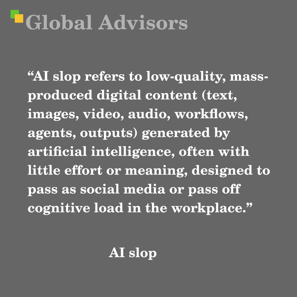 “AI slop refers to low-quality, mass-produced digital content (text, images, video, audio, workflows, agents, outputs) generated by artificial intelligence, often with little effort or meaning, designed to pass as social media or pass off cognitive load in the workplace.” – AI slop